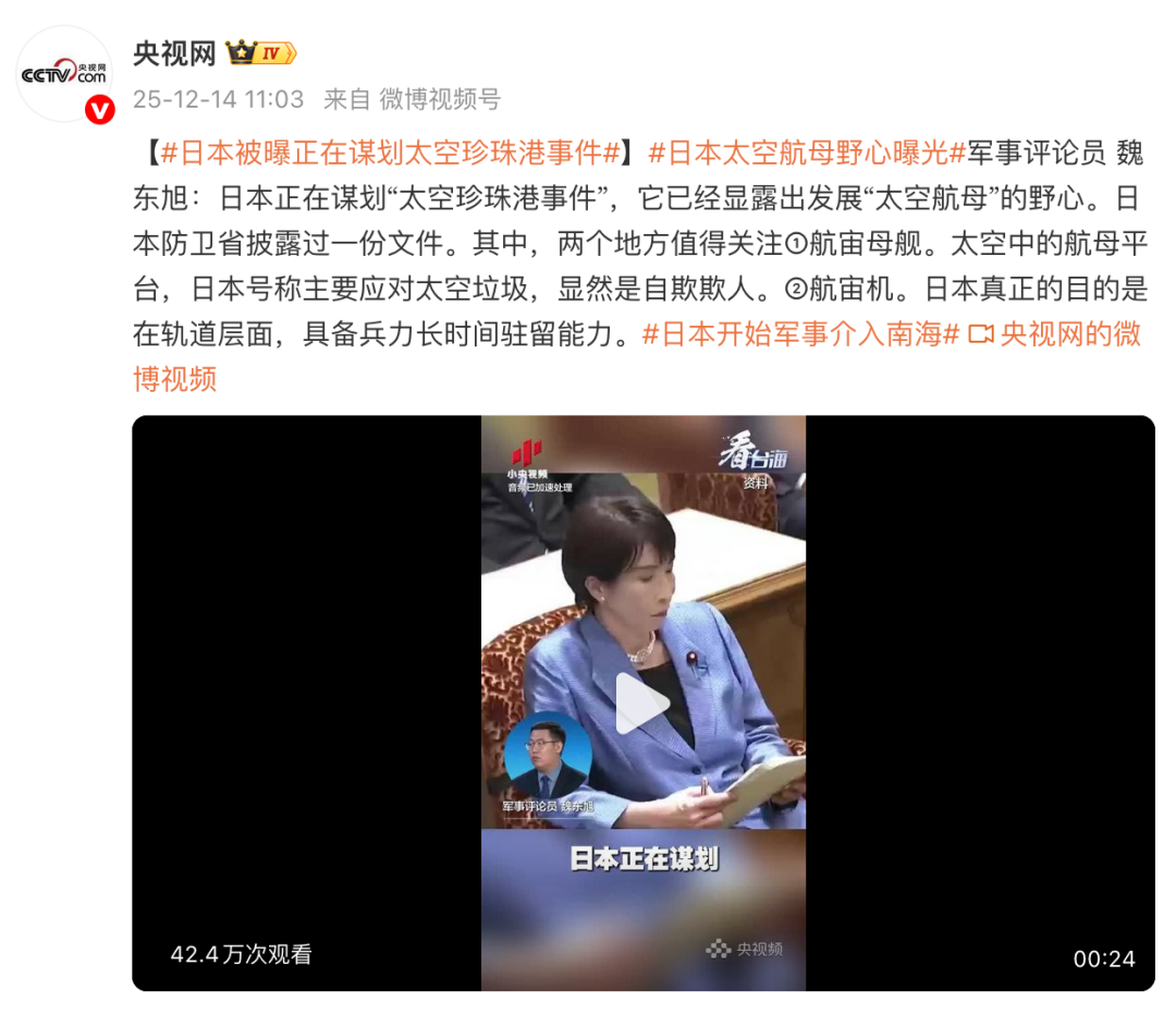 12月14日,据@央视网消息,军事评论员魏东旭称,日本正在谋划“太空珍珠港事件”,它已经显露出发展“太空航母”的野心。