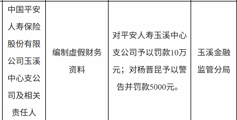 12月30日,中国平安人寿保险股份有限公司玉溪中心支公司及相关责任人因编制虚假财务资料被罚款10万元;杨晋昆被警告并罚款5000元。